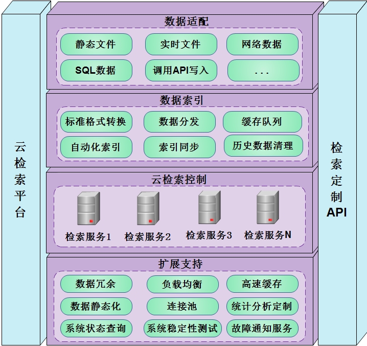 整合各检索服务的统一计算能力,快速完成检索响应。 四、扩展支持 1、 数据冗余:将数据按一定规则在服务器中形成备份,提高系统可靠性; 2、 负载均衡:在高并发量的条件下,将请求均匀的分发给各服务器,避免出现某一服务器长时间超负荷运作的情况; 3、 高速缓存:自动将某一时间段内检索频率较高的数据,放入高速缓存序列,为以后重复的查询提供快速服务,避免重复浪费检索资源; 4、 数据静态化:对执行过2次以上的历史检索数据,将数据源作为序列化文件存放在本地硬盘,再次检索时直接返回该反序列化对象(较为消耗硬盘空间); 5、 连接池:将连接信息缓存在内存中,减少消耗在连接上所用的时间; 6、 统计分析定制:可根据需要,灵活的对统计分析需求进行定制,便于后续调用; 7、 系统状态查询:系统管理员可通过图形化界面,直观的了解到系统中各服务器以及服务的运行情况; 8、 系统稳定性测试:在预定的时间间隔后,自动对系统各部件进行稳定性测试; 9、 故障通知服务:系统自动进行稳定性测试后,如果发现异常,可以通过预定义的通知方式及时的将故障通知给系统管理员; 五、检索定制API 可根据调用语言、传入参数、返回类型进行接口定制,方便与上层系统无缝对接。